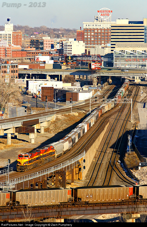| Blasting up the KCT High Line behind a pair of matching Belle SD70ACe's is KCS Train G-HVUP 06, bound for the other side of the river, where a UP crew will take over and yard the hoppers at a grain elevator in Fairfax for loading. Sharp eyes might be able to pick out KCS 34, the Southern Belle painted F-Unit at Union Station in Track 280. |