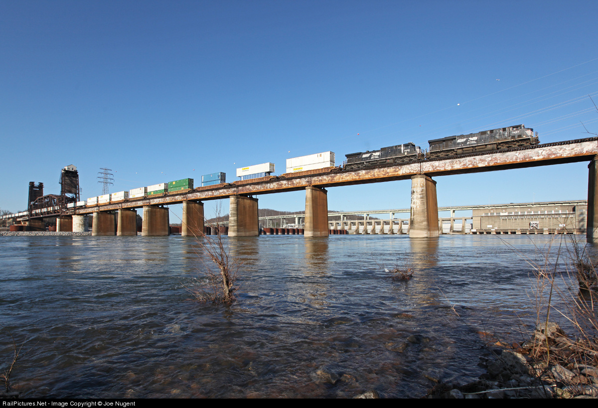 NS 7507 and 8858 lead a consist across the river passing in front of the massive dam built to create Lake Chickamauga.