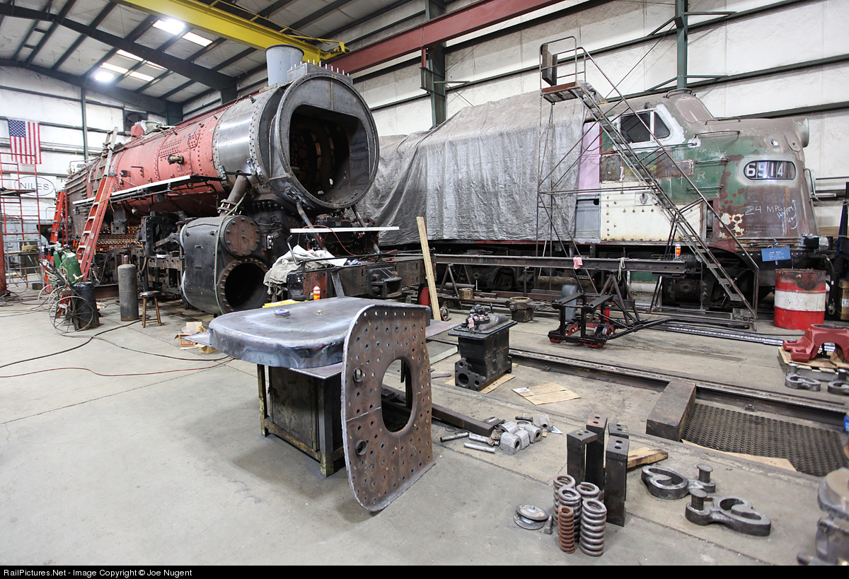 | Southern 4501 is drawing closer to completion in the Soule Shops at TVRM. Workers were busy in the firebox area and on axle journals while this pic was taken. That E in the background makes for a nice conversation piece for diesel fans, if your into that kinda thing... |