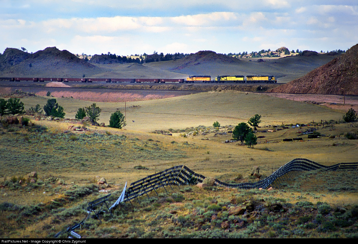 A CNW C40-8 and SD60 along with a UP SD40-2 pull a train of gondolas through Dale Junction on Sherman Hill. Snow fences are common on Sherman Hill, placed to control snow drifts.
