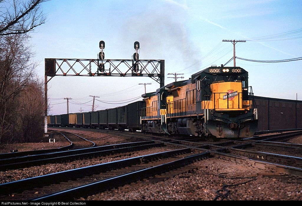 Typical coal train power inbound on the CNW. This shot is near impossible to get nowadays as Richard is standing in what is the middle of the "hobo fire pit" surrounded by a high fence at the Rochelle Railroad Park |