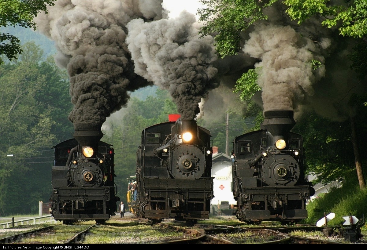Cass Shay #4, Western Maryland Shay #6 and Cass Shay #11 race during Cass Railfan Weekend sponsored by MSR&LHA.