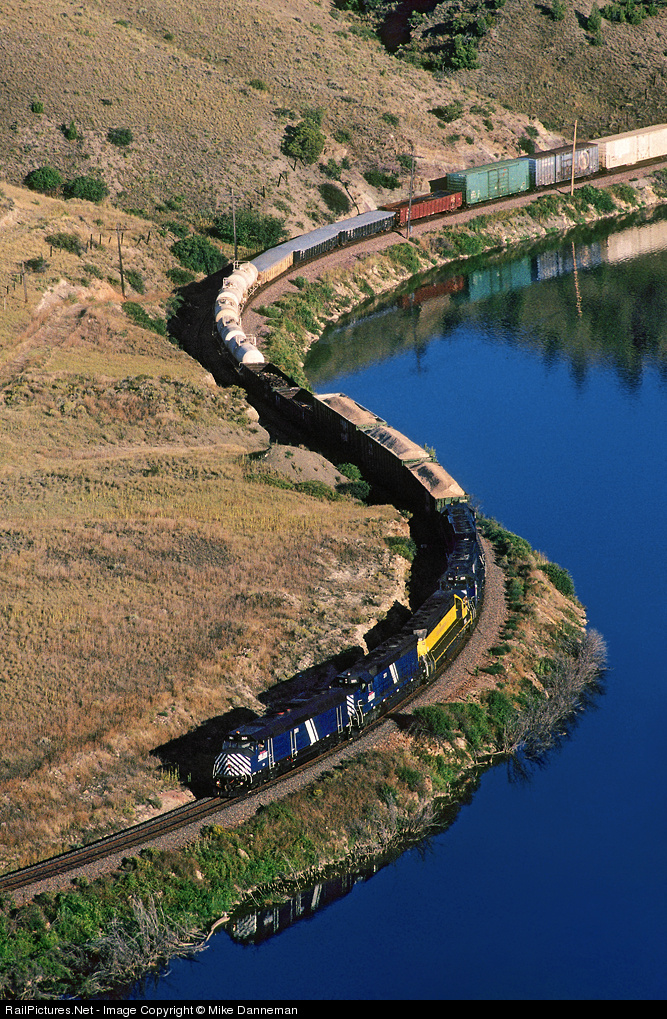 Montana Rail Link train LM (Laurel to Missoula freight) snakes through Lombard Canyon on the afternoon of September 11, 1995. On the point is F45 No. 391 leading four more big EMDs along the calm waters of the Missouri River.