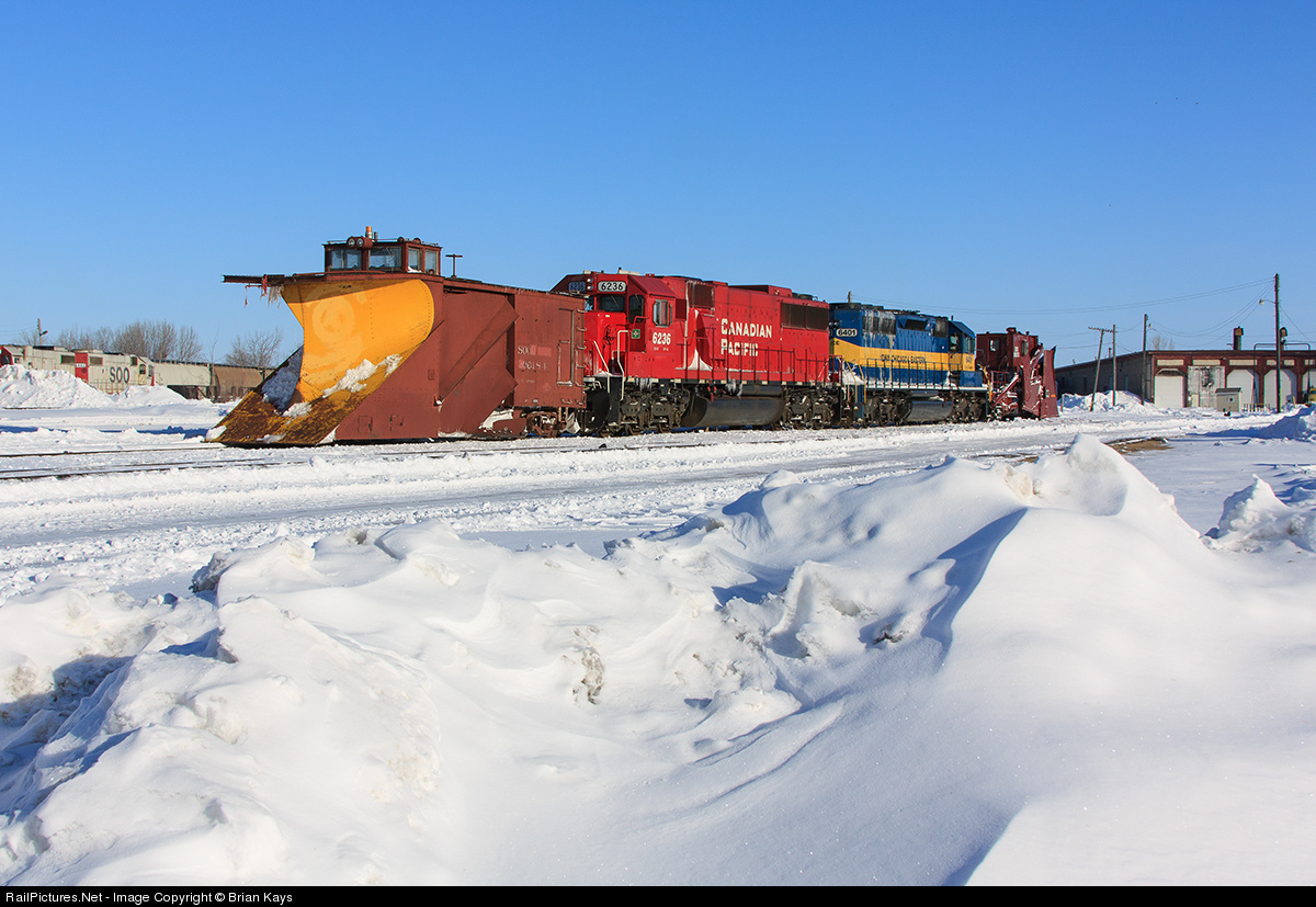 | The resident snow plows in Thief River Falls saw action the previous night clearing crossing and sections of track where wind has blown the massive amount of snow received in the area, evident even by the drifts in the foreground. Guiding the plows are CP 6236 & ICE 6401. |