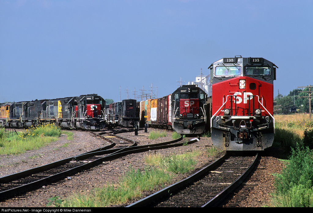 Hoisington yard is jam packed with Southern Pacific trains on September 3, 1995. On the left, a freight led by No. 8668 has one of the crew struggling with a couple of bags of ice on the front platform, and will be soon departing eastbound. This former Missouri Pacific route was how Rio Grande/SP trains got to Kansas City from Colorado’s Tennessee Pass line from Pueblo. The yard is much, much quieter now, with this through main line route severed in two places; abandoned west of Herington to Geneseo, and McCracken to Healy, all in Kansas.