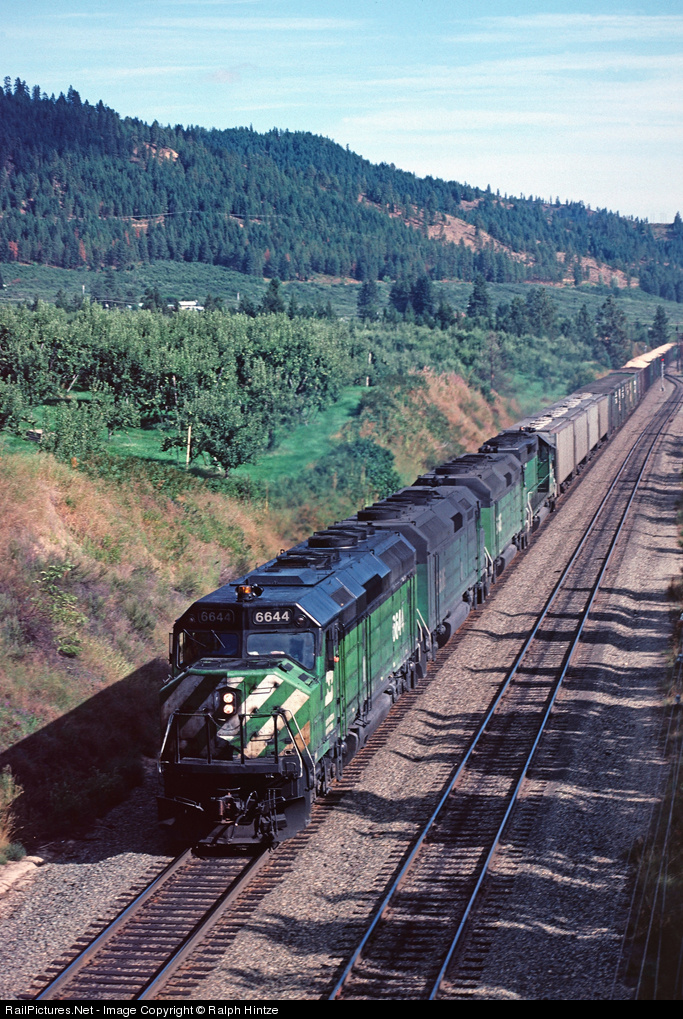 | BN 6644, one of three F45's on this train, leads a westbound freight on the main at Leavenworth, WA. |