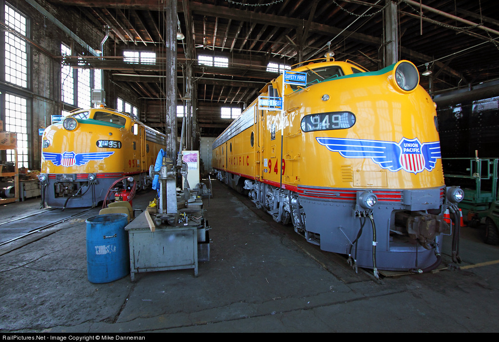 Inside the Cheyenne, Wyoming, roundhouse on March 25, 2013, Union Pacific’s two E9As wait for another season of pulling passenger trains. Both were built in 1955, and in the early ’90s, UP sent them to VMV Enterprises in Paducah, Kentucky, to be remanufactured. They emerged in 1993 with a new 16-cylinder 2,000-hp EMD 645 engine (replacing original twin 12-cylinder 1,200-hp 567 engines), with AR10 alternators and GP38-2 design electrical systems.