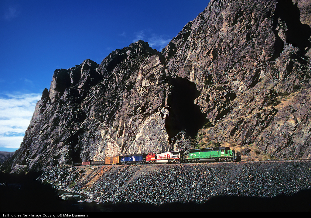 Green, red and blue A westbound BNSF freight exits Black Tunnel in scenic Wind River Canyon south of Dornick, Wyoming, on October 2, 1997. Leading the colorful consist is Burlington Northern SD40-2 No. 8177, followed by Santa Fe C40-8W No. 901 and Montana Rail Link F45 No. 390.