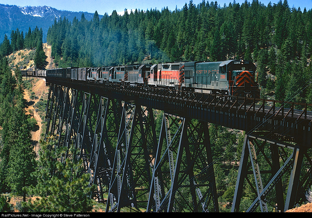 | A lone GE unit commands five EMDs as they lead tonnage eastward across one of the largest trestles on the Western Pacific at Clio, near Blairsden, Calif. on June 18, 1974. The train will travel the length of the WP to Salt Lake City where some of it will be interchanged to the D&RGW and the U.P. |
