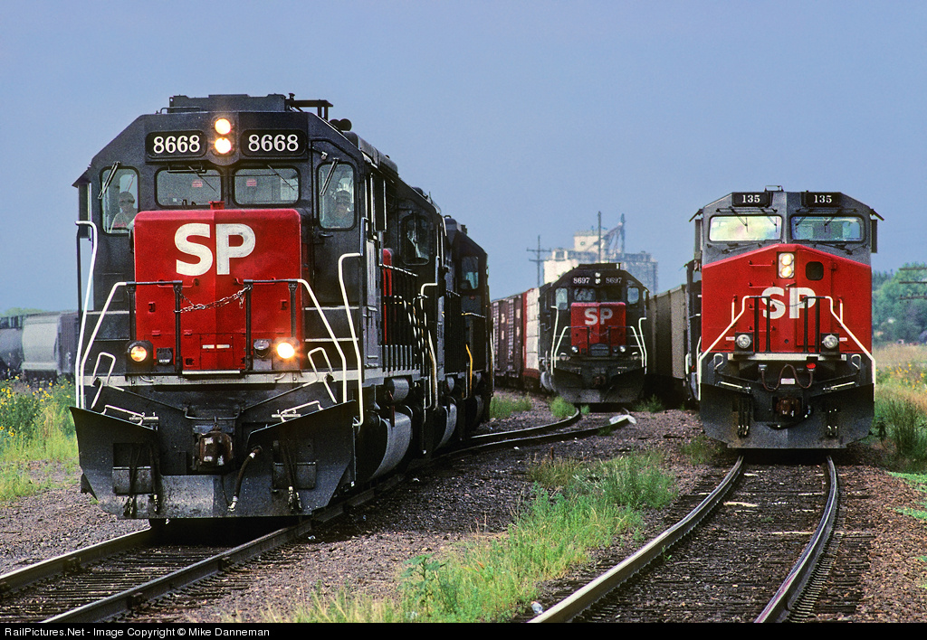 Eastbound freight led by Southern Pacific SD40M-2 No. 8668 departs a plugged Hoisington Yard at Hoisington, Kansas, on September 3, 1995. Two more eastbounds wait on the adjoining tracks for new crews. This former Missouri Pacific route between Herington to Pueblo was formerly operated by Rio Grande to gain access to Kansas City, and became a link in SP’s central corridor. Today, with two segments of the route torn up and abandoned, this yard and crew change point is a lot quieter!