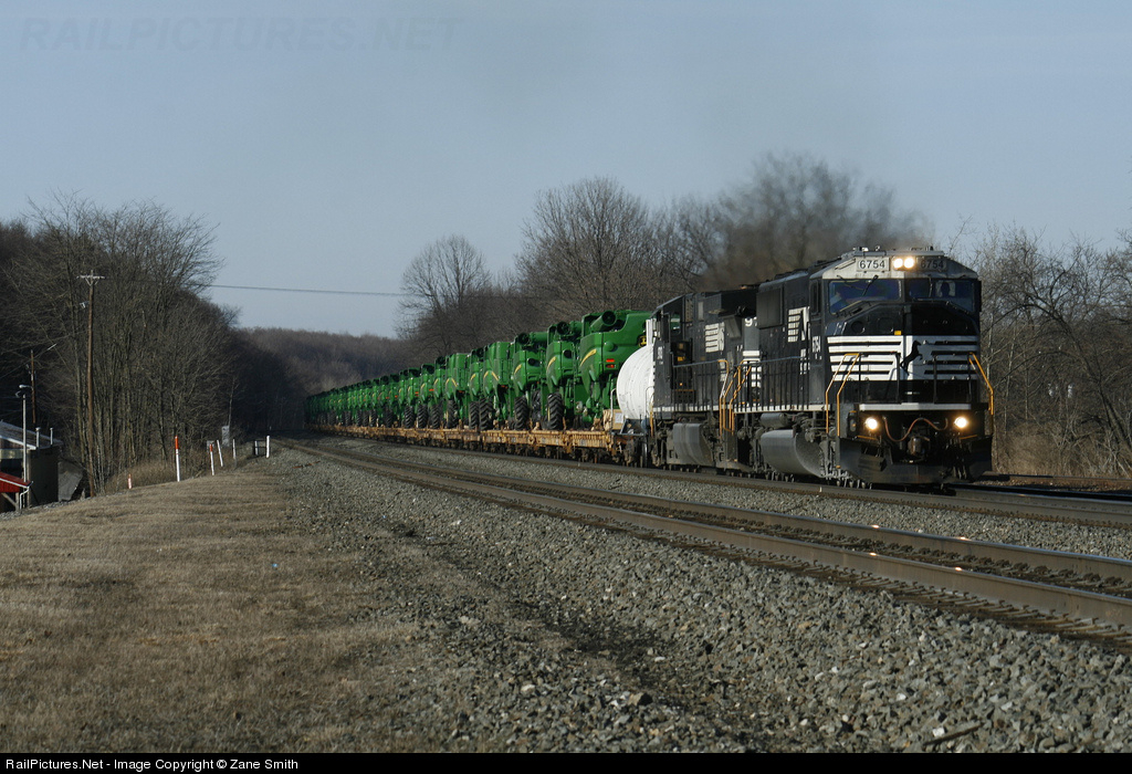 | NS Train 60G also known as 62A or the "John Deere Exspress" Has 99 John Deere Combine Loads, each combine is estimated to be worth $425,000. Thats a pretty exspensive train.... |