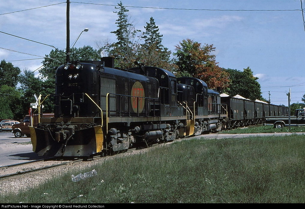 | D&M 1077 leads a stone train from the Big Cut quarry near Millersburg, MI.