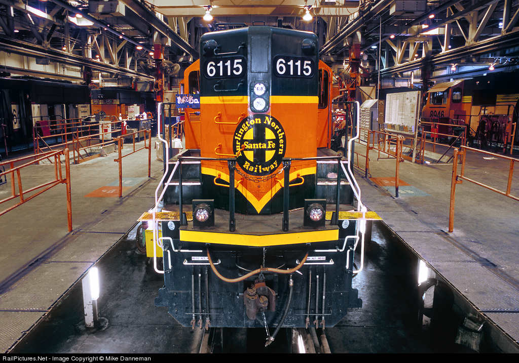 Surrounded by AC technology and 4,000 h.p. locomotives in the Alliance, Nebraska, Diesel Shop, 1959-built SD9 No. 6115 gets a well-deserved rest for some work on July 21, 2003. The spiffy-looking high-hood Phase IV SD9 was former Colorado & Southern No. 832 and BN No. 6227—repainted into its then current livery by OmniTrax in the summer of 2000.