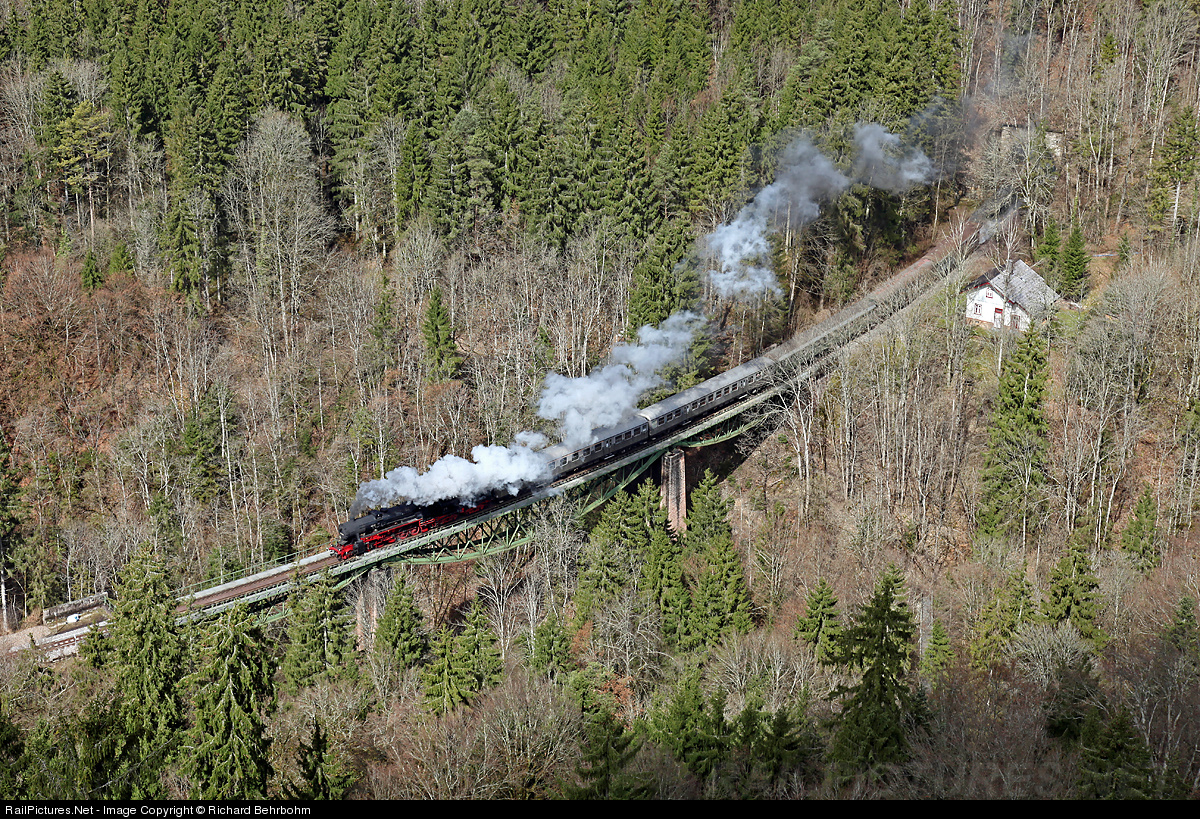 | 52 7596 of association Eisenbahnfreunde Zollernbahn (EFZ) is pulling a train of the Sauschwänzlebahn from Weizen to Zollhaus-Blumberg over the bridge in the Wutach Canyon. |