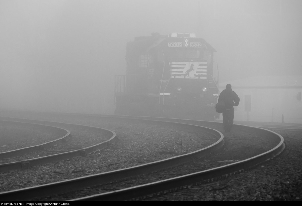 | Vagrant in the Mist While NS G66 goes about putting together its train out of frame in the morning vapor, a drifter walks into the early forenoon fog unaware of the train performing work ahead. |