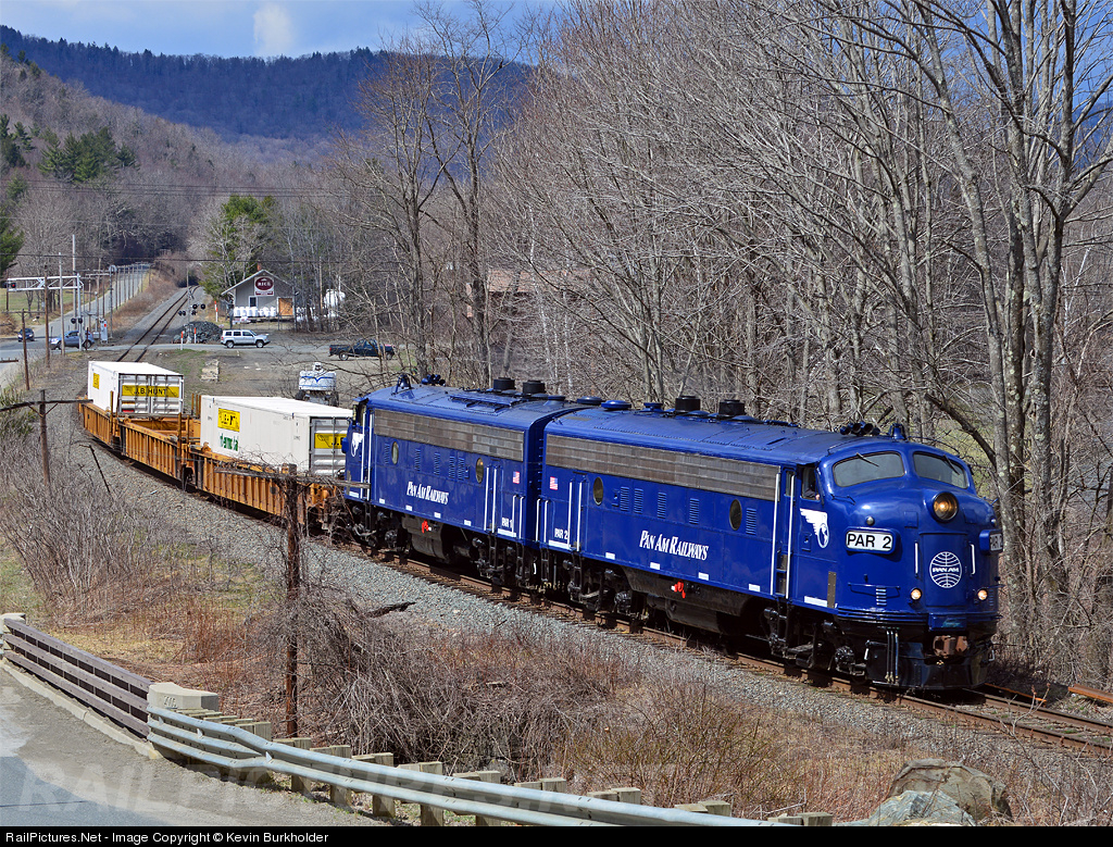 | Pan Am Railways FP9s - PAR-2 and PAR-1 - lead a single 3-well intermodal car eastbound at Charlemont, Massachusetts on the way from Mechanicville to Ayer, Massachusetts. The pair had hauled a private car passenger extra to Mechanicville on April 13 and were used to haul freight back eastbound on Sunday, April 14. |