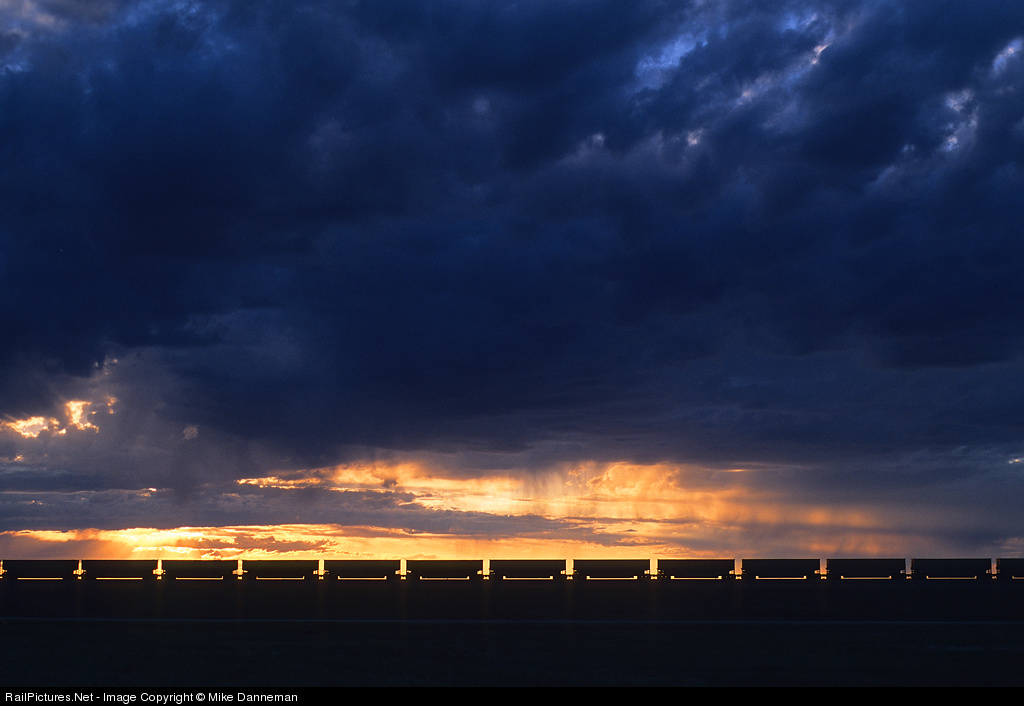 Amid a stormy sky, coal trains continue the daily march to the mines of Powder River Basin south of Bill, Wyoming, during dawn on May 30, 2009.