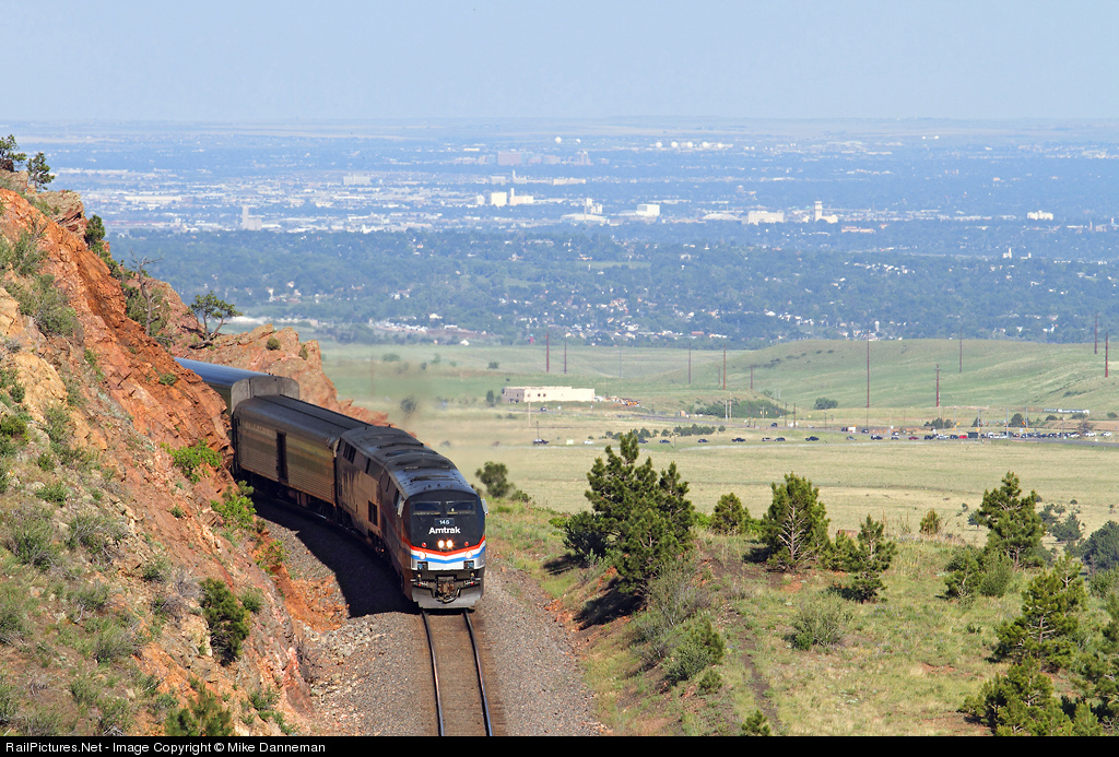 Amtrak’s “Phase III Heritage” No. 145 is on the point of the eastbound California Zephyr on the afternoon of June 22, 2011. Passing through Tunnel 1, the train is about to cross Coal Creek Canyon, and head to Clay and Rocky on the decent off the Front Range. Denver Union Station is still 23-rail-miles ahead, and the north metro area of Denver is far below in the background.