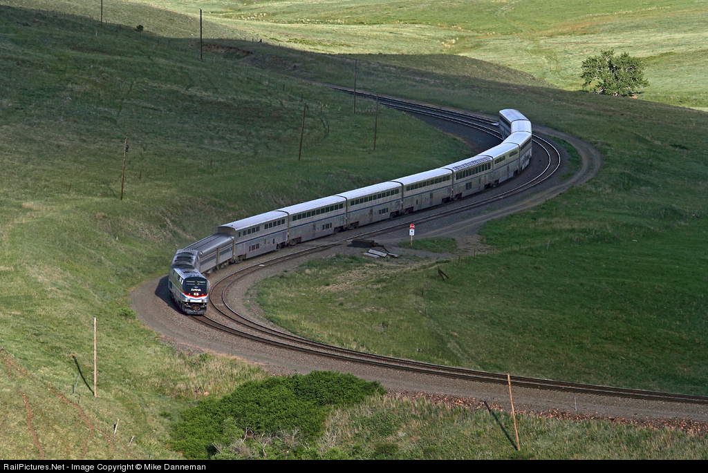 Amtrak No 5, the California Zephyr, passes through a cloud shadow at Rocky, Colorado, on the afternoon of June 25, 2011. “Phase III Heritage” No. 145 leads the tardy westbound train at 6:40 p.m., running about ten hours late.