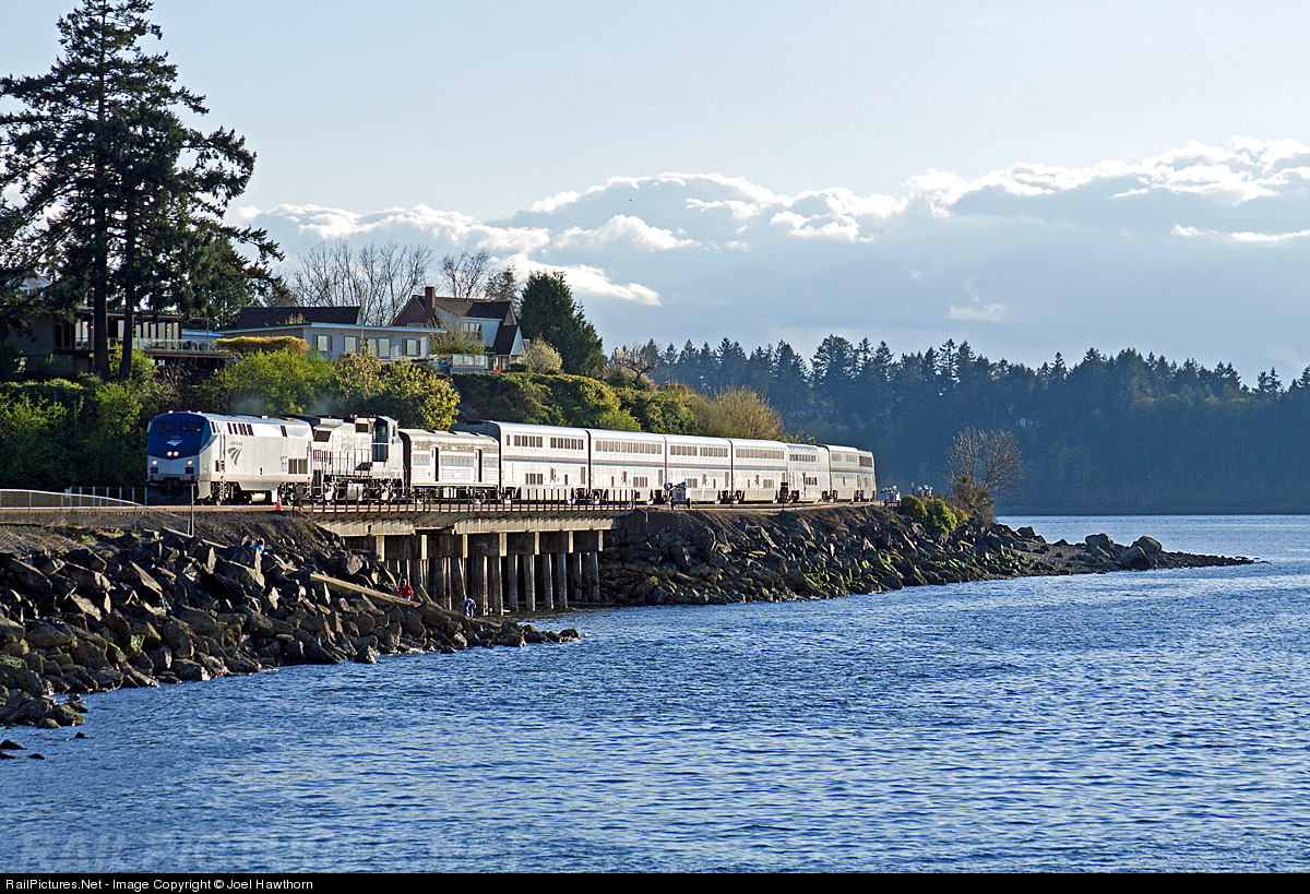 Running daily between Seattle and Los Angeles, this train offers running alongside the Pacific Ocean and through the Cascade Mountains. It has been one of Amtrak's long-distance success stories.