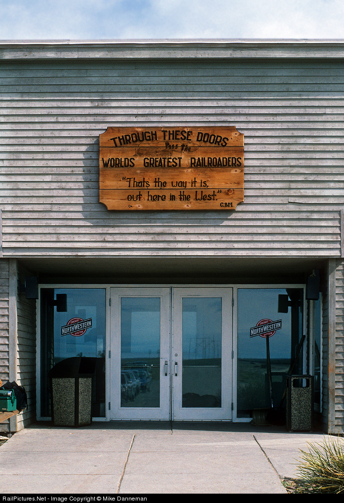 A rustic, hand-made sign above the entrance to Chicago and North Western’s yard office in Bill, Wyoming, reads “Through these doors pass the Worlds Greatest Railroaders… That’s the way it is, out here in the west.”