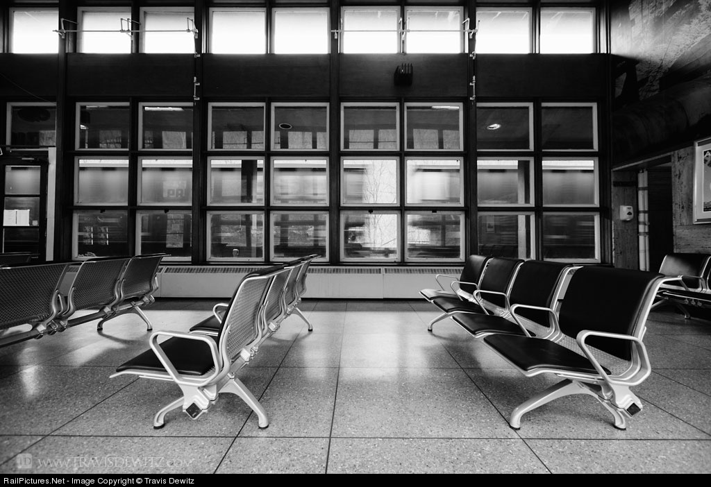 Second hand passenger seats from the Washington DC Amtrak station have found there way into the Prince, West Virginia train station. A speeding CSX coal train can be seen passing the station.