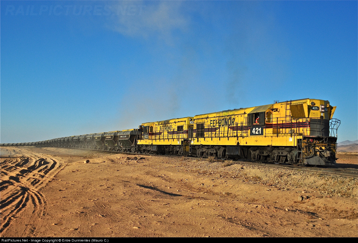 In the most arid and dry desert in the world, the Atacama Desert located in the north of Chile, moves the iron train, freight train of the railway company Ferronor, which transports the iron from the mine "Los Colorados" to the seaport of Huasco in the III Region of Atacama. In the picture, the loaded train passes by "Chehueque" in the desert, up a hard slope with 4 locomotives GM EMD GR12, 2 to the front and 2 locomotives pulling from behind.
