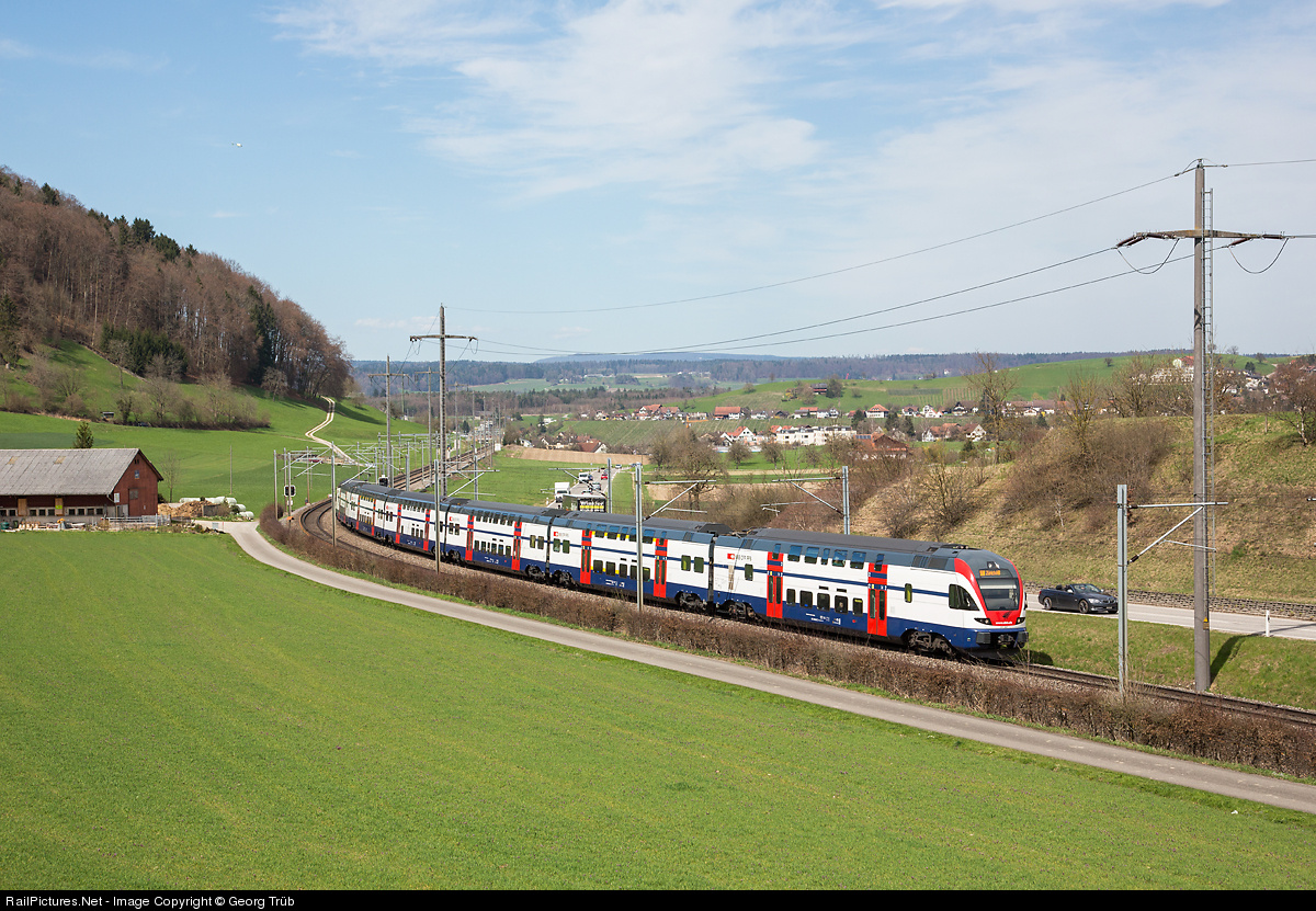 | Double deck 6 car trainset "KISS" or "RV Dosto" (double deck train for regional services) RABe 511 007 as train Regio Express 3777 from Schaffhouse to Zurich near Eglisau. 30 (like this one) out of the 50 ordered 6 car trainsets will have the dark blue paint for the Zürich commuter services of the ZVV, the other 20 the dark grey of the SBB for Regio Express services. |