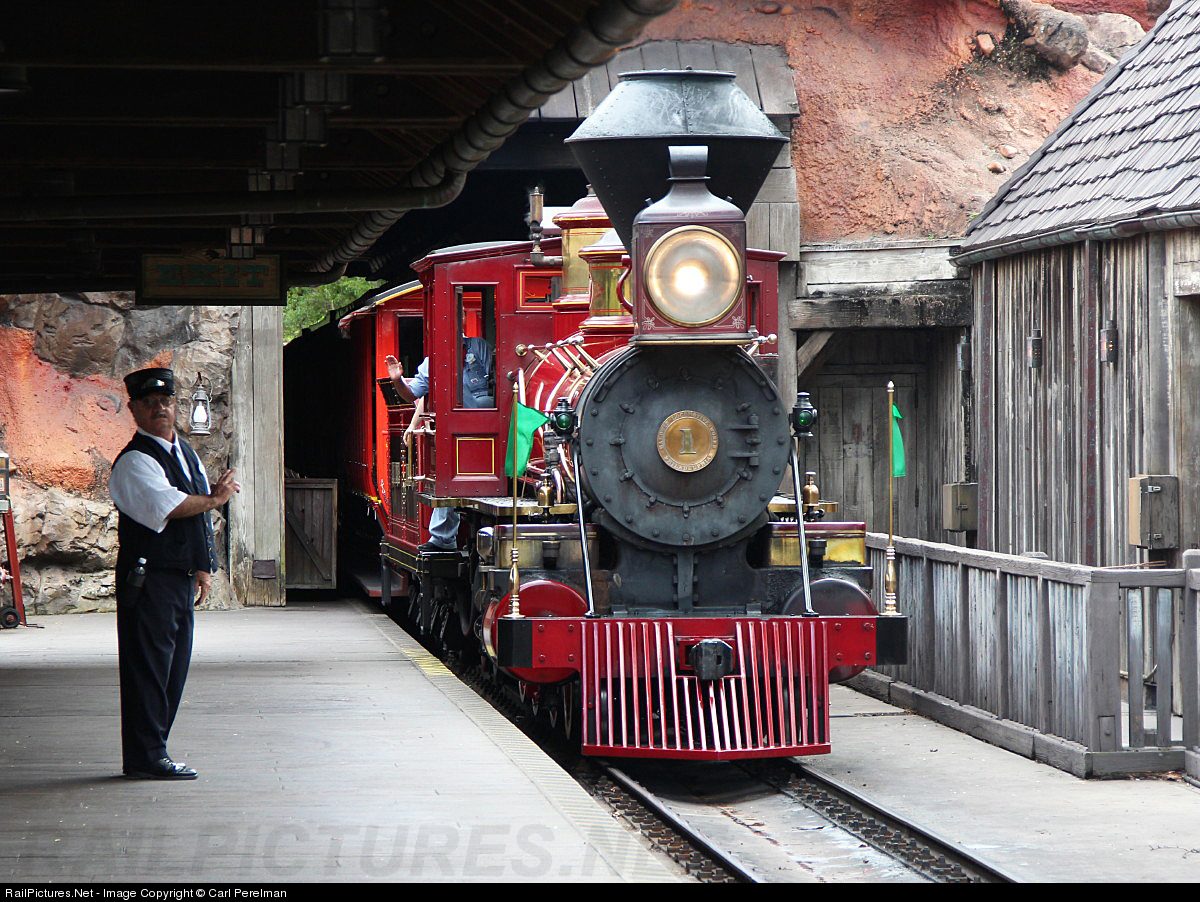 Walt Disney World Railroad 4-4-0 No. 1 is passing through the only tunnel on the railroad, beneath Splash Mountain. The train is pulling into the Frontierland station. The No. 1 was originally constructed by the Baldwin Locomotive Works for the Ferrocarriles Unidos de Yucatan in Mexico. It is named after the theme park found, Walter E Disney,