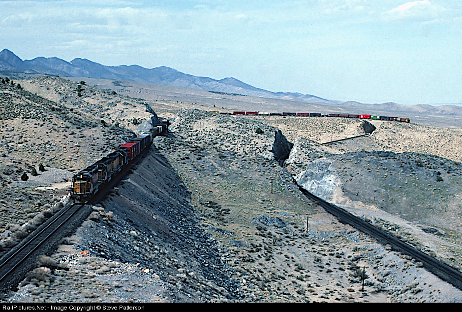 | With paired operations west of Ogden and Salt Lake City between UP and Western Pacific, UP 3563 leads its westbound train around WP's Arnold Loop near the eastern edge of Nevada on April 18, 1980. Much further across the state at Winnemucca, the tracks will go their separate ways on to California. |