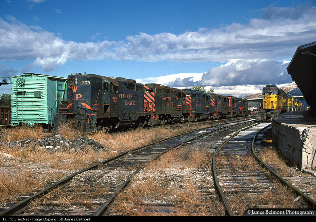 | Six Western Pacific GP7s and GP20s await disposition in Union Pacific's South Yard in Salt Lake City. The WP 703 found new life working for Mountain Diesel Transportation. The stored Union Pacific SD40-2s were returned to service when traffic levels picked up. The yard tracks, warehouse, dock, and cantilever signal bridge at Grant Tower are all gone today. |