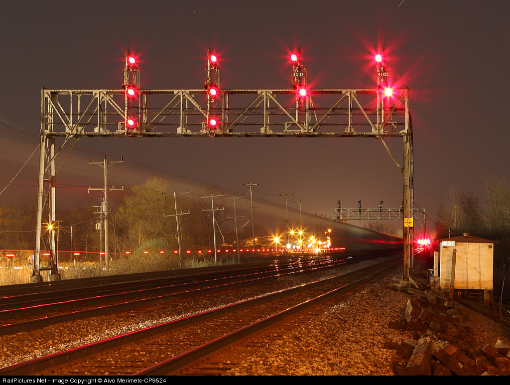 Classic New York Central searchlight signals guard CP 431 as the FRED of an eastbound flashes by. The eastbound would wait at the next control point for the railway to clear up.