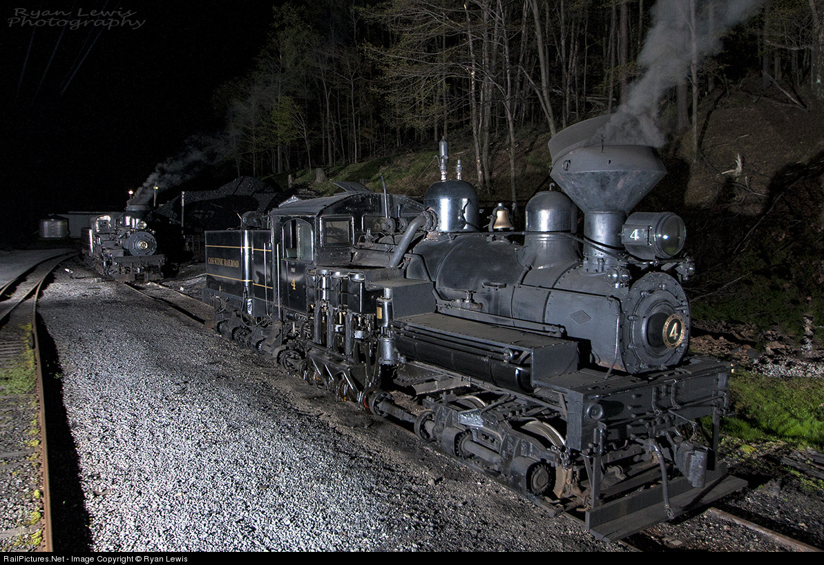 A Man and a Ladder Seen from above, Cass Scenic Railroad's Shay 4, and Shay 11 are seen on the coal dock track. These two engines will sit here until Cass Railfan Weekend (2013), and for the new season to begin entering Cass' 50th year of operation. Thanks to Joe Gonzaelz for the lighting! Thanks to Cass Scenic Railroad