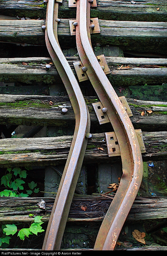 This is what happens when rails are subjected to intense heat. The "sulphite bridge" in Franklin, New Hampshire, is a wooden covered bridge structure typical to New England. It was built in 1896. The last train crossed it in 1973. A fire inside the bridge on October 27, 1980, which is believed to have been arson, damaged the entire structure. The charred bridge trusses remain standing, however; and these bent rails tell the story of the intense heat that scorched the ancient timbers — which neither collapsed during the fire nor in the thirty years and counting since the fire occurred. The "sulphite bridge" got its name because this line primarily carried goods to and from nearby paper mills. Be sure to check photo no. 435049 for another view of this bridge!