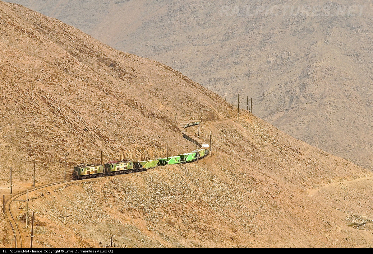 Carmelita curves: One of the MONUMENTS most recognizable of the Tocopilla coastal, old but still brilliant BoxCab 289A GE Electric Locomotives built in 1927, no major problems up the grade (slope) of 4.1% from seaport to the courtyard of "Barriles" for the gorge of same name ... In search of Salitre from Maria Elena. In the photo, the train down to the seaport loaded with Salitre, across multiple curves and the edge of the precipice of the gorge. It's a fantastic journey, incredible watching these veteran locomotives unique in the world.
