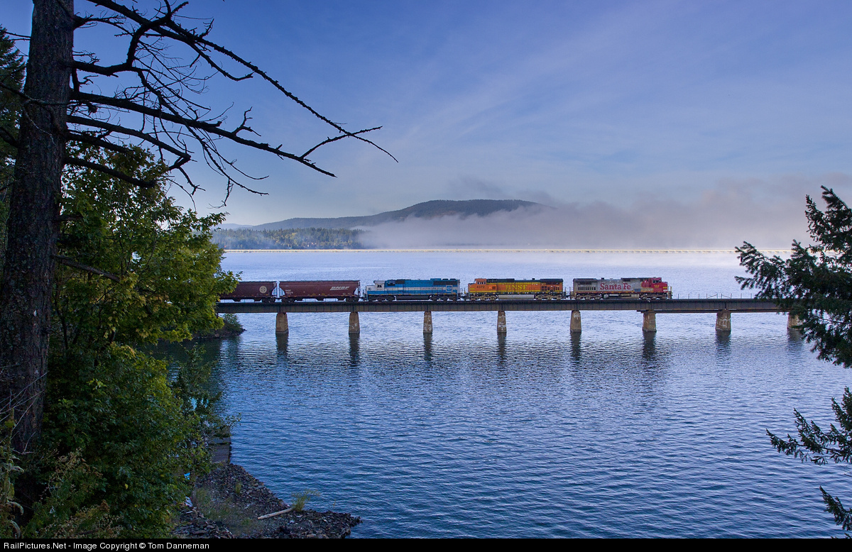 Early morning fog lifts over Highway 95 in the distance, as an eastbound BNSF grain train begins the long crossing over Lake Pend Oreille at Algoma, Idaho. In the lead are two Dash 9s and an old Oakway SD60. After crossing the bridge, the train will enter Sandpoint.