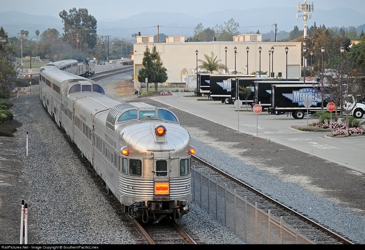 | Three ex-California Zephyr cars trail Amtrak 11 Southbound, giving a small representation of the famous streamliner on the back of a modern Amtrak train. |