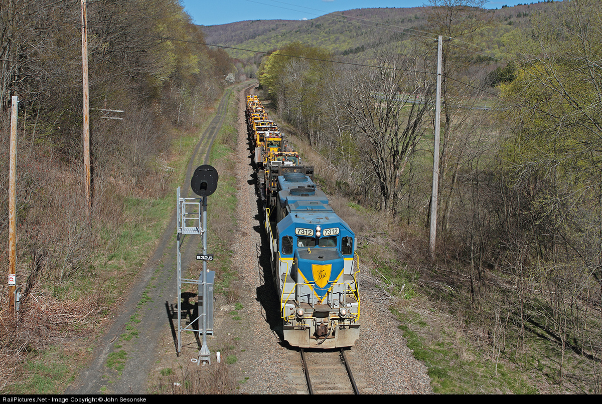 Searchlights and lightning stripes. The searchlights, even these modern ones, are on borrowed time. Hopefully the same is not true for CP's "heritage" unit D&H 7312 seen hauling 9 flatcars of track equipment moving from Colonie, NY to Binghamton, NY and points south.