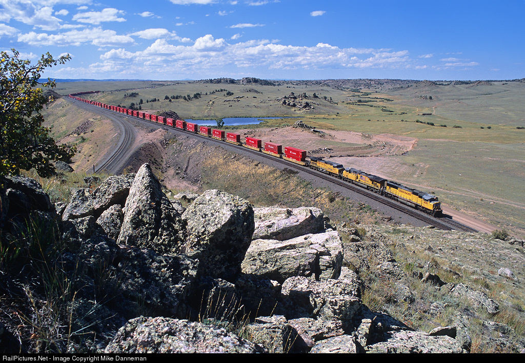 An eastbound Union Pacific K-Line stack train cruises by Dale, Wyoming, over Track 1 on a beautiful September 17, 2008. Dale is a junction with Track 3 curving off to the left, a low-grade line UP constructed in 1952-53 as an alternate westward main over the hill.