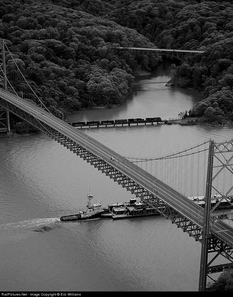 Competing modes of transportation move north under the Bear Mountain Bridge. There are 4 bridges seen from this vantage point with the smallest being the Popolopen Creek suspension bridge that carries the Appalachian Trail across the water. During the revolution, a pontoon bridge was built near the same location that connected two forts that protected the Hudson River from the British.