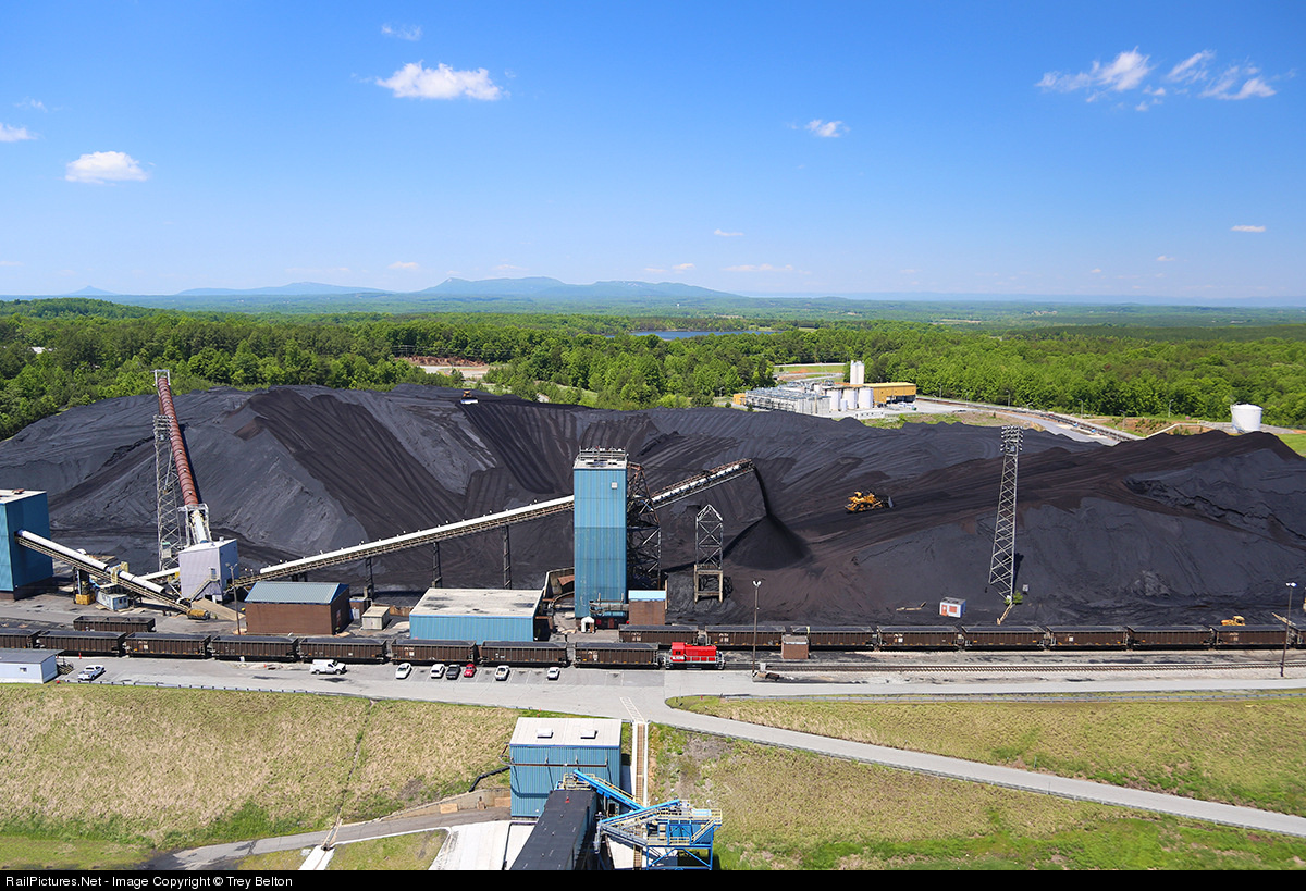 The Republic yard switcher moves coal hoppers into position to emptied by the rotary car dumper. The bulldozer on the pile is a Caterpillar D11. There is approximately 1.8 millions tons of coal in the pile.