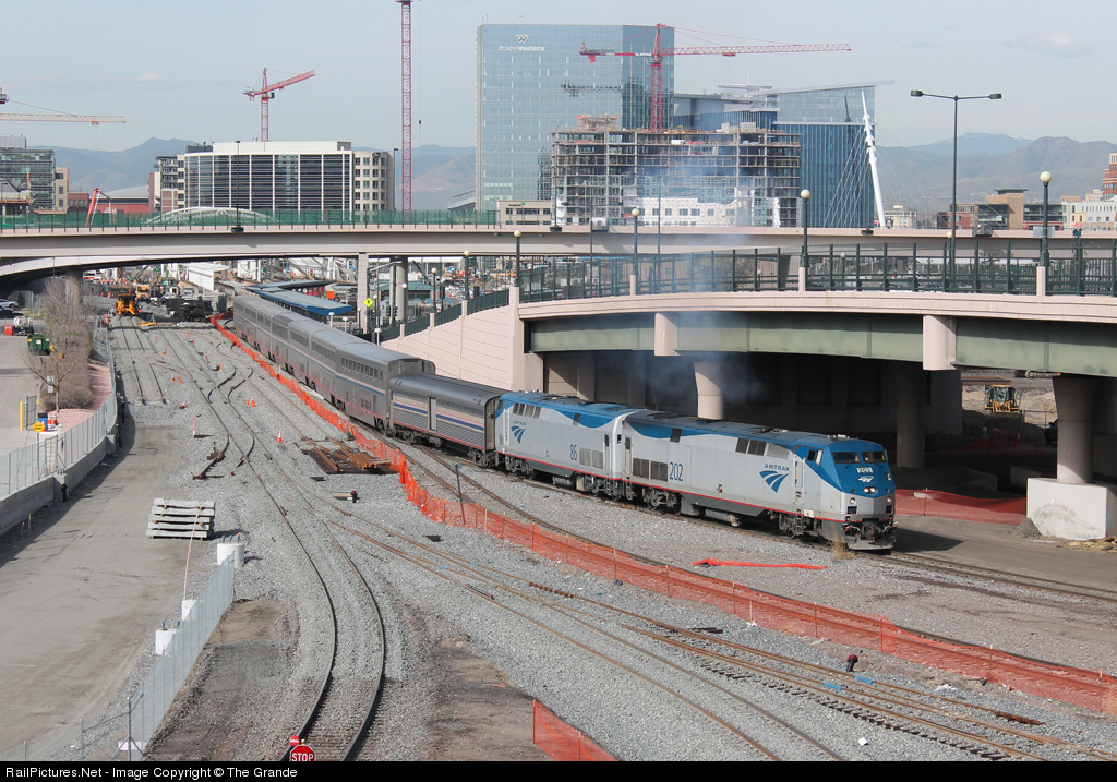 | Amtrak train #5 is finally departing now an hour behind schedule after a complex locomotive swap in Denver. The train is pulling away from the temporary station as work is continuing on the modern Denver Union Station project to the left. Denver's regional transportation that connects the city will all tie into this massive facility slated to be opened in just over a year. |