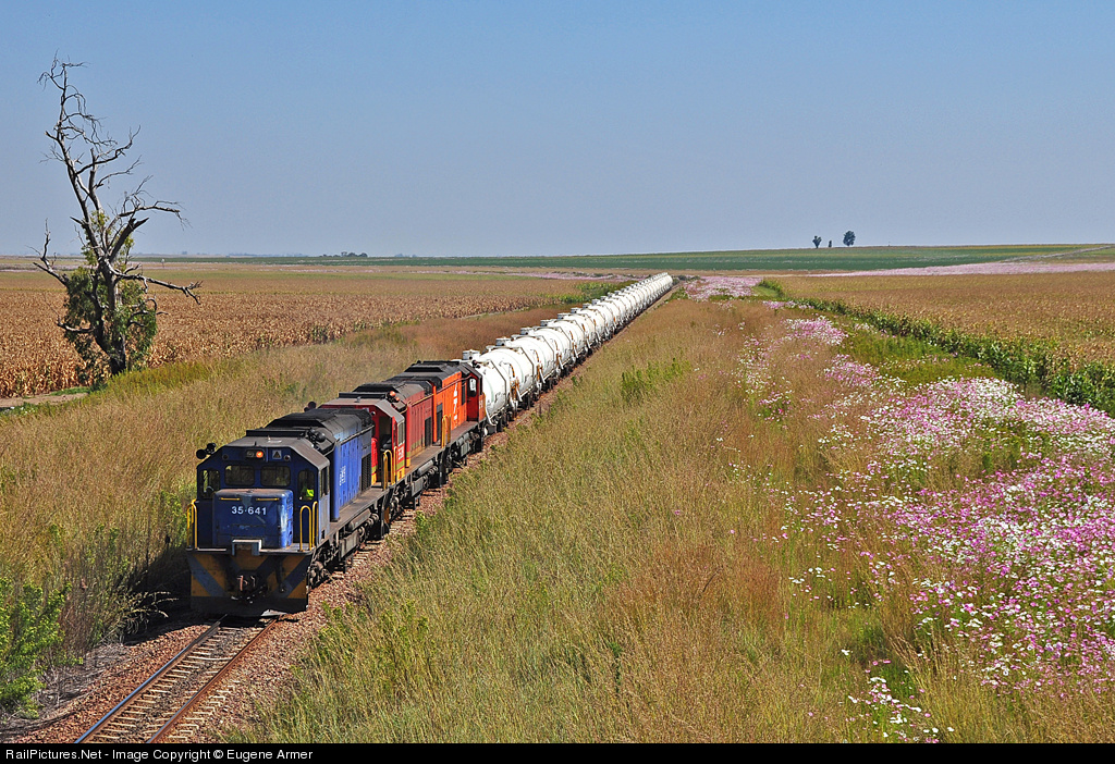 Masses of cosmos flowers in bloom amongst the maize fields of the eastern highveld provide some added colour to this scene of a class 35-600 in faded blue Spoornet livery and two 35-200's in TFR red and Spoornet orange, working a block load of 26 Anhydrous Ammonia tankers. The train is eastbound to Trichardt on the Springs - Bethal secondary line. The tankers are headed for the Sasol plant at Secunda, which is served by a private siding from the exchange yard at Trichardt.
