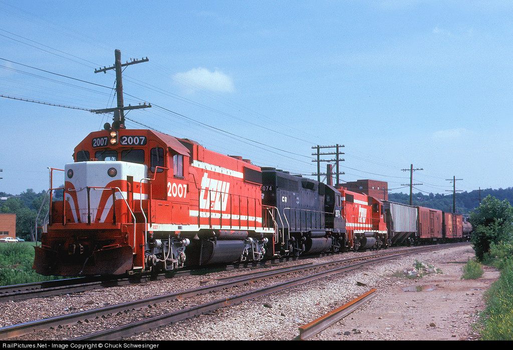 TP&W power passed through Fort Madison on run through trains to Kansas City during the 80's. This is a westbound with TPW 2007, CR 3074 and TPW 2008 leading 25 cars along Santa Fe's well maintained double track main.
