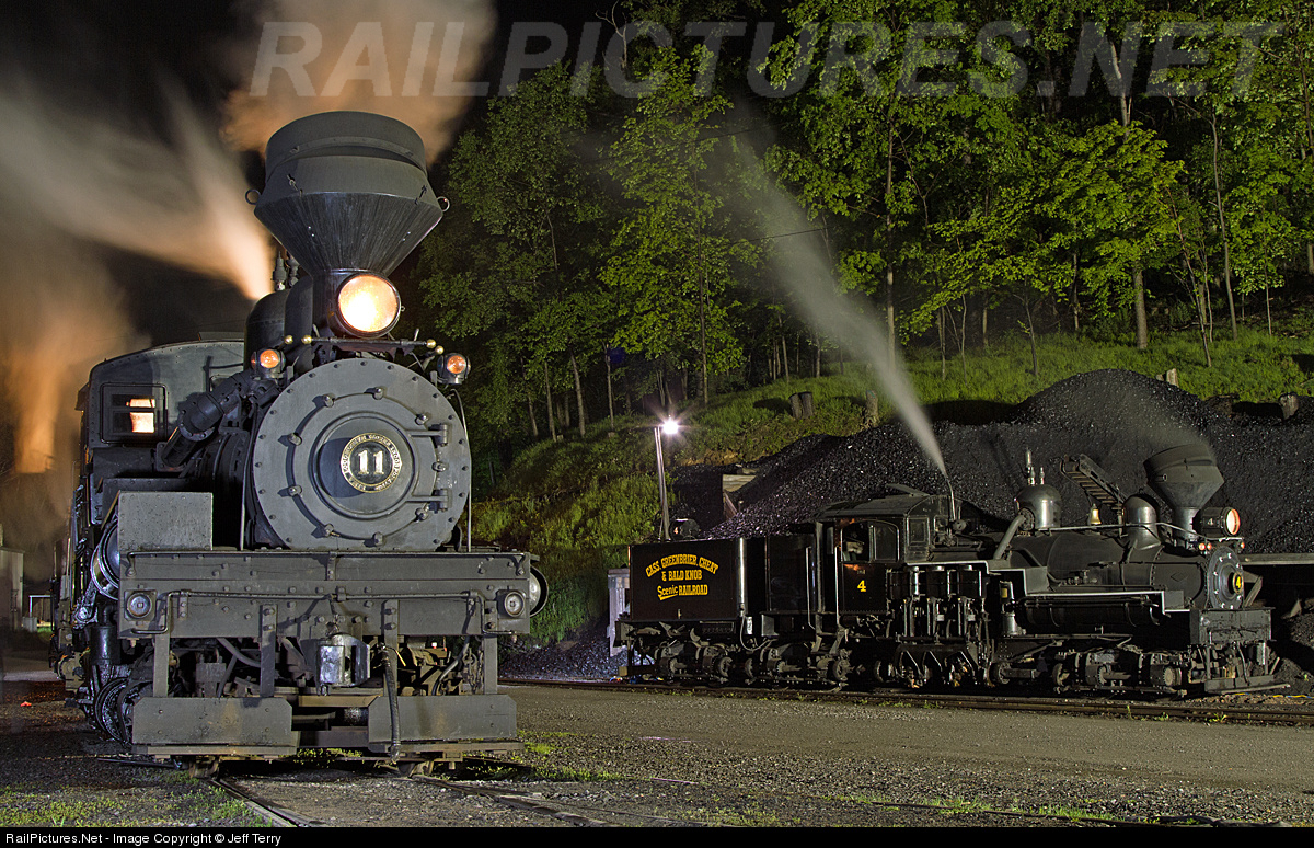 | Shays 11 and 4 pose for night photos at the Cass Scenic shop. Lighting provided by the Mountain States Railroad & Logging Historical Association, which also sponsored Cass Railfan Weekend 2013. A great time was had by all! |