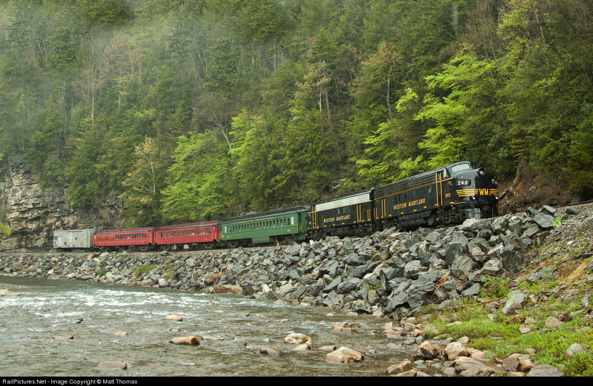 | Mountain State Railroad and Logging Historical Association held it's 2013 Railfan Weekend May 17 through 19 at Cass Scenic RR State Park in Cass WV. They kicked off the 2013 Railfan Weekend by hosting a trip over the West Virginia Central from Cheat Bridge to High Falls. Here the F units work their way along the Shavers Fork in a steady rain fall. |