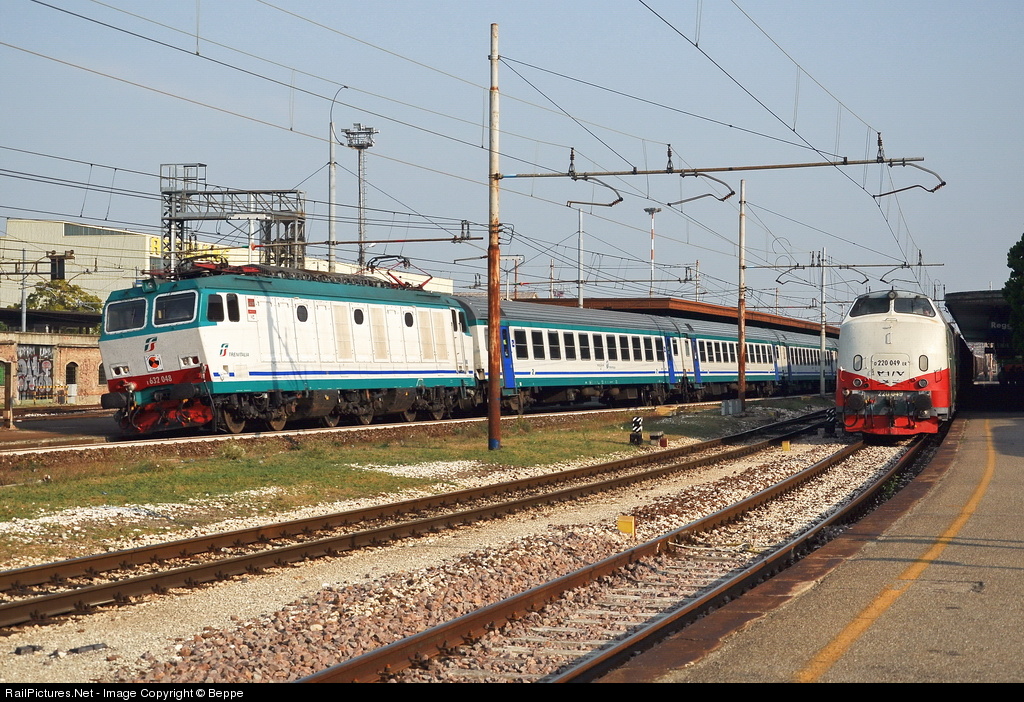 | The passenger train starts after the stop at the station, heading north on the track that curves slightly cant. To the right a freight train pulled by a diesel locomotive class 220 of FER "Ferrovie Emilia Romagna" is stopped to give way. |