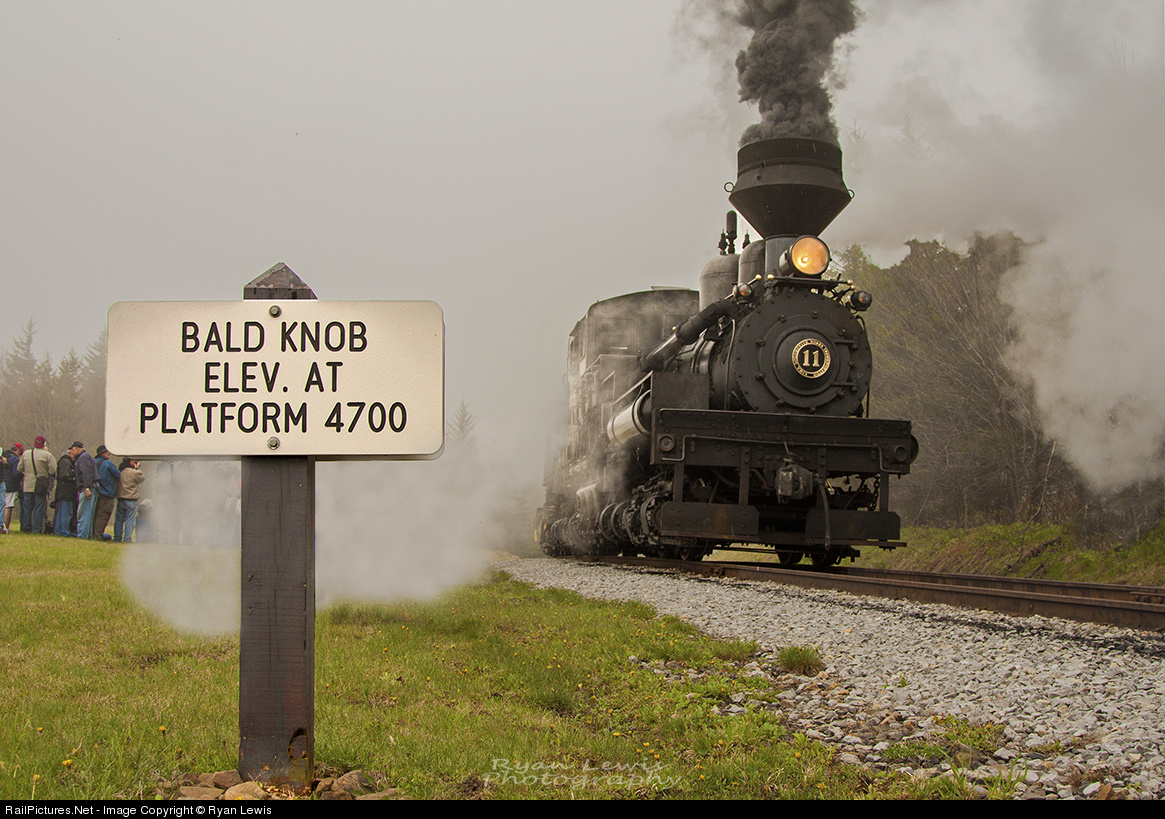 | Cass' Shay 11 approaches Bald Knob in a thick layer of fog as he prepares to de-train to allow the 300+ railfans attending Cass' Railfan Weekend to eat lunch and prepare to head back down the mountain back to Cass to prepare for the night photo session. Thanks to Cass Scenic Railroad