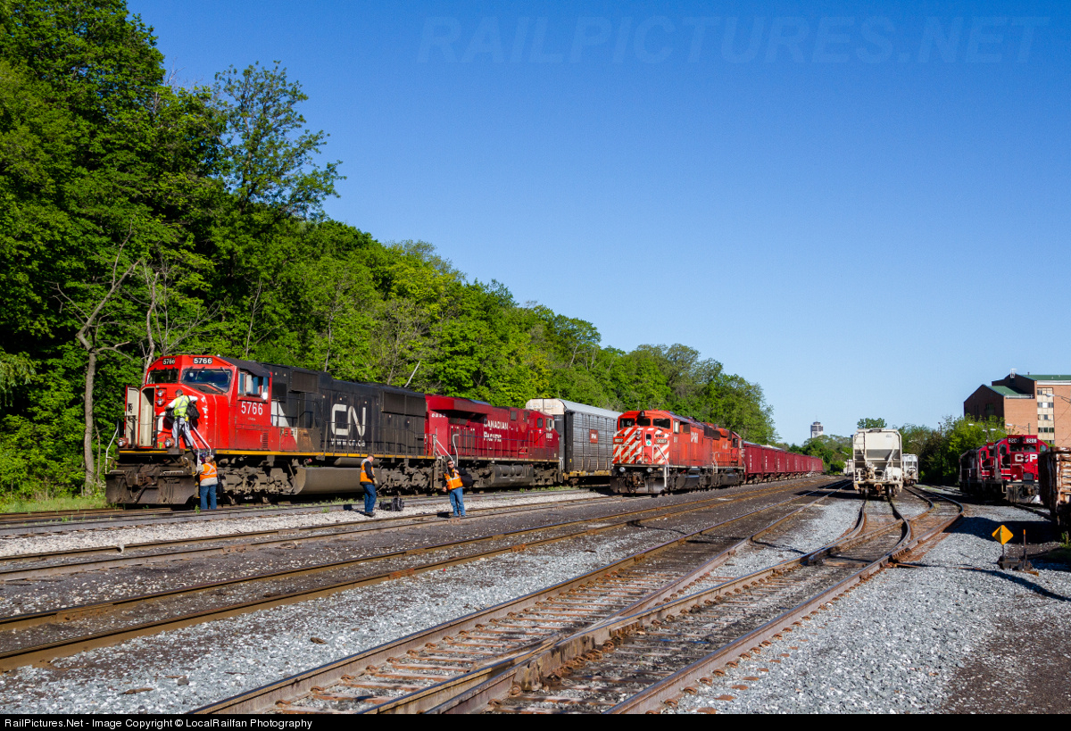 Oddities and action at Kinnear: With some remaining horsepower hours to use up, CN 5766 made its way into the lead position of Sudbury-Buffalo manifest 246. After dropping off its load of steel at SteelCare in Aberdeen Yard, CP 246 is seen making its second stop in Hamilton at Kinnear Yard for a quick crew change. To the right of 246 is a Herzog Ballast train led by 9007, one of a few remaining EMD SD40-2Fs on the CP System coined 'Red Barns'. Idling in the extreme right of the frame is a trio of EMD GP9s, assigned to switch along the Hamilton Belt Line and on transfer duty to Aberdeen. Can you say this is as good as it gets?