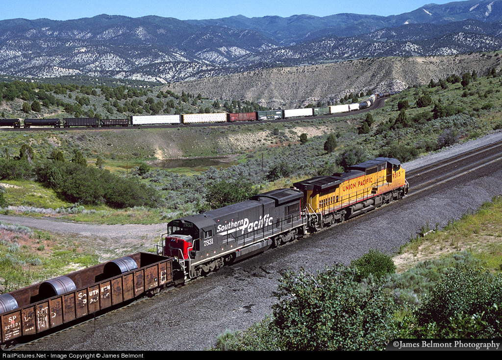 UP's Salt Lake City to Denver manifest climbs eastward through the photogenic upper Gilluly horseshoe curve on the climb to Soldier Summit. The 80 car train is 4681 feet long with 6133 tons moving at a steady 15 mph. Out of view (at left) is a three pack of Rio Grande tunnel motors cut in mid train.